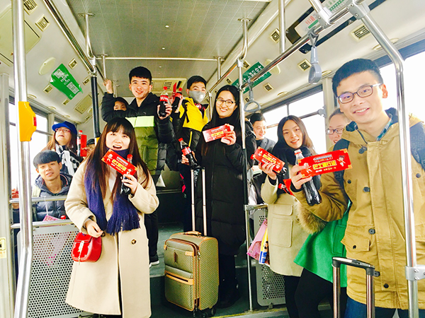 2017年1月13日“春運大潮”正式開始,第一波主流人群就是學(xué)生,除了搶車票,擠候車廳,還有前奏就是擠公交,搶出租車去車站。為了讓同學(xué)們更順利的回家,可口可樂在鄭州5所高校打造了愛心專列巴士,持續(xù)5天往返于車站和學(xué)校之間,助力按時抵達?!斑€有什么比回家更開心的嗎?還有什么比,邊喝可口可樂邊看別人擠公交車更開心的嗎?愛心巴士好贊,讓我們的歸家路無比快樂和暖心!” 河南輕工業(yè)大學(xué)大三耿嘉尉同學(xué)高興的說著。