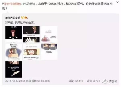 這條漫畫以陳安妮自己為主角,講述的是她在別人認(rèn)為只有1%成功可能的情況下,堅持畫畫、創(chuàng)業(yè)、做APP的故事。漫畫推出隨即大熱,“姚晨轉(zhuǎn)了,趙麗穎也轉(zhuǎn)了”,在短時間內(nèi)就達(dá)到了45萬轉(zhuǎn)發(fā),閱讀人數(shù)超過2億。