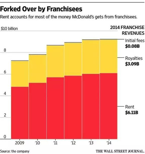 這是雷·克羅克在早期設(shè)計(jì)麥當(dāng)勞的特許經(jīng)營(yíng)模式時(shí),就留下的一個(gè)獨(dú)到之處:為了加強(qiáng)控制權(quán),所有門店所需要的土地物業(yè),都要由麥當(dāng)勞總部出面收購(gòu),再轉(zhuǎn)租給特許經(jīng)營(yíng)商,每年按略低于市場(chǎng)價(jià)的水平收購(gòu)租金。在房地產(chǎn)市場(chǎng)節(jié)節(jié)攀升時(shí),租金收入會(huì)水漲船高;而一旦特許經(jīng)營(yíng)商表現(xiàn)欠佳,也可以隨時(shí)將他們“掃地出門”。一些持有麥當(dāng)勞股票的對(duì)沖基金經(jīng)理們甚至曾經(jīng)想過(guò),把麥當(dāng)勞的餐飲和房地產(chǎn)業(yè)務(wù)拆分成兩部分,以便更有效地管理資產(chǎn)。