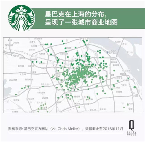 以目前星巴克在全球布局最密集的城市之一上海為例:目前近 500 家門店已經(jīng)覆蓋整個(gè)市中心、以及后期開發(fā)出來(lái)的數(shù)個(gè)城市副中心。