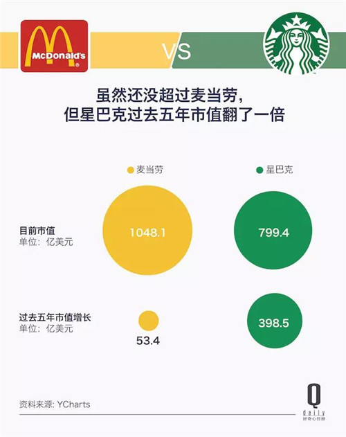 也就是說(shuō),星巴克將會(huì)超越麥當(dāng)勞,成為全球最大的連鎖餐飲公司。如果都按照現(xiàn)在我們認(rèn)知意義上的星巴克、麥當(dāng)勞來(lái)算,這個(gè)時(shí)間不到 40 年。