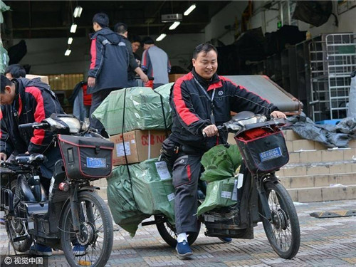 (作者:?jiǎn)涡聦?雙十一期間,順豐快遞員在送貨,圖片來(lái)自視覺(jué)中國(guó),未經(jīng)授權(quán),請(qǐng)勿使用