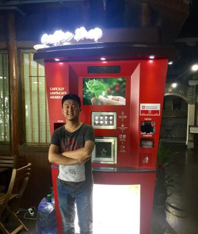 陳述在自己的無(wú)人咖啡店和“店員”合影?!$娦馈z