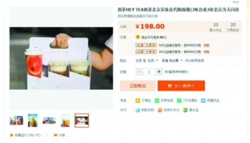 “炎熱的夏季,喜茶?排隊?我們可以免去你所有不必要的麻煩,你只需要坐在家里等著喝就好了!喜茶代購!”、“喜茶HEY TEA奶茶北京實體店代購,現(xiàn)做,口味自選3杯,北京當天閃送”……此類喜茶代購宣傳語在貼吧、微博、淘寶等各種網(wǎng)絡(luò)空間上不難找到,排長隊的喜茶總是伴隨著黃牛代購。
