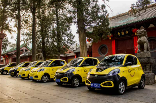 在少林寺門口,偶遇排列整齊的“一步用車”,可以在智能手機上租用的小電動汽車。