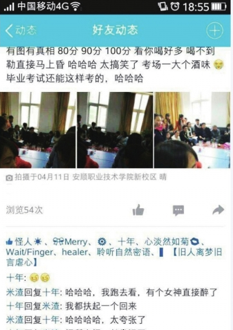 4月12日,報(bào)道了安順職業(yè)技術(shù)學(xué)院一名教師與學(xué)生在辦公室飲酒,并聲稱(chēng)以喝酒多少來(lái)定考試成績(jī)之后,引起了該學(xué)院高度重視。據(jù)了解,目前,涉事教師已停職接受調(diào)查。