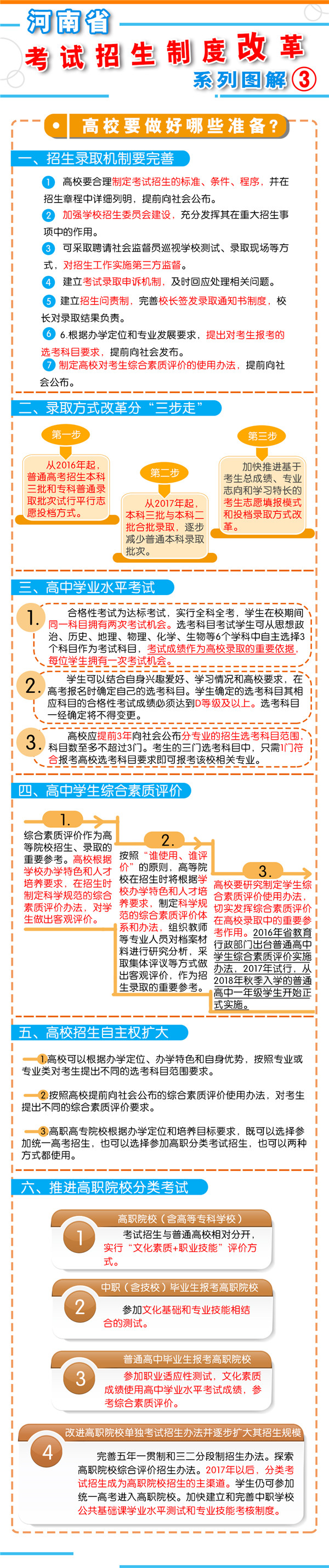 一、促進升學(xué)機會公平 逐步增加我省考生接受優(yōu)質(zhì)高等教育的機會,逐步增加農(nóng)村學(xué)生升入重點高校人數(shù),減少和規(guī)范高考加分,完善中小學(xué)招生辦法?! ?strong>二、改革考試形式和內(nèi)容 完善高中學(xué)業(yè)水平考試??荚嚪譃楹细裥钥荚嚭陀嬋敫咝U猩浫】偝煽兊倪x考科目考試(簡稱“選考科目考試”)。合格性考試范圍覆蓋國家規(guī)定的高中所有學(xué)習(xí)科目的必修內(nèi)容。選考科目由考生根據(jù)報考高校要求和自身特長,從思想政治、歷史、地理、物理、化學(xué)、生物等科目中自主選擇3科。學(xué)生在校期間,可以參加同一科目的兩次合格性考試、一次選考科目考試?! ∵M一步規(guī)范高中學(xué)生綜合素質(zhì)評價。建立全省規(guī)范統(tǒng)一的高中學(xué)生綜合素質(zhì)檔案,完善學(xué)生綜合素質(zhì)評價電子化管理平臺,客觀記錄學(xué)生成長過程中的真實表現(xiàn),確保程序嚴(yán)格、公開透明、內(nèi)容真實可信?! ⊥七M高職院校分類考試。高職院校(含高等??茖W(xué)校)考試招生與普通高校相對分開,實行“文化素質(zhì)+職業(yè)技能”評價方式。中職(含技校)畢業(yè)生報考高職院校,參加文化基礎(chǔ)和專業(yè)技能相結(jié)合的測試。普通高中畢業(yè)生報考高職院校,參加職業(yè)適應(yīng)性測試,文化素質(zhì)成績使用高中學(xué)業(yè)水平考試成績,參考綜合素質(zhì)評價。 深化考試內(nèi)容改革。依據(jù)國家高中課程標(biāo)準(zhǔn)和高校人才選拔、培養(yǎng)要求,科學(xué)設(shè)計命題內(nèi)容,增強基礎(chǔ)性、綜合性,突出能力、創(chuàng)新導(dǎo)向,著重考察學(xué)生獨立思考和運用所學(xué)知識分析問題、解決問題的能力。