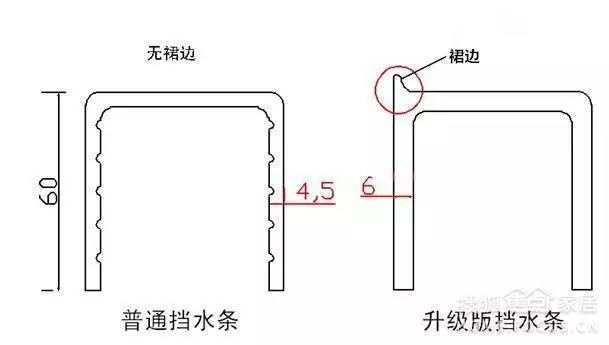 有些賣家吹噓有裙邊的擋水條有多好,實際上是誤導消費者。有裙邊的擋水條實際上是用在帶玻璃的淋浴房下面做石基用的,玻璃是放在擋水條中間的,裙邊是防止水從玻璃下滲入擋水條。