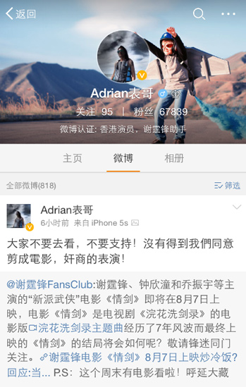 那么,《情劍》的兩位“主演”謝霆鋒與鐘欣桐為什么沒來宣傳本片呢?馬云對此表示:“兩位演員都還有別的戲要拍,沒時間來宣傳我們的電影?!钡皫兹崭勖絾柤傲藘扇说慕?jīng)紀(jì)人霍汶希,對方稱《情劍》片方根本沒有通知他們上映的事,更沒有邀請二人宣傳。而在微博上認(rèn)證為“香港演員、謝霆鋒助手”的網(wǎng)友“Adrian表哥”也發(fā)微博指責(zé)片方并沒有得到謝霆鋒的同意,是奸商行為。另外,記者也查閱了《情劍》的官方微博,該官微在開辦至今僅發(fā)7條微博,有90個粉絲??梢哉f,《情劍》除了一組有“抄襲嫌疑”的海報之外幾乎是在沒有任何宣傳的情況下推進院線的。