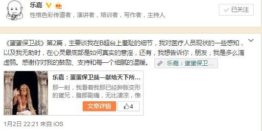 樂嘉在文中不僅敘述了傷后2次就醫(yī)照B超的過程,以及對醫(yī)療人員現(xiàn)狀的一些感知,還在文中自我安慰稱“我開始想我的丫頭靈兒,嗯,還好,樂門有后啦;我開始想40歲時(shí)幸好做了精子冷凍”。