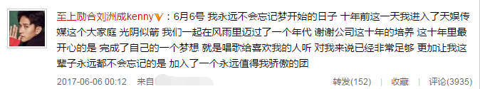 鳳凰網(wǎng)娛樂訊 6月6日,劉洲成在微博發(fā)文表示自己將離開待了十年的天娛,稱很感激公司這十年的培養(yǎng)以及能夠加入至上勵合這個組合,他說幾個成員都像他最重要的家人。他還表示,最近有人想要把這十年的努力毀掉。