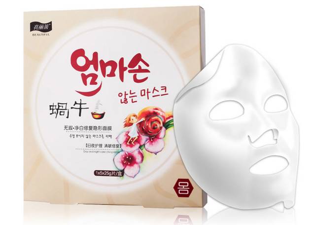 標(biāo)稱廣州市尚氏化妝品有限公司、廣州市強(qiáng)邦化妝品有限公司聯(lián)合出品的亮麗萊蝸牛無暇凈白修復(fù)隱形面膜。