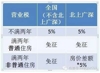 但“北上廣深”四個一線城市暫不實施,也就是說,北上廣深在營業(yè)稅政策方面仍實行財稅〔2015〕39號文,即個人購買不足2年的住房對外銷售的,全額征收營業(yè)稅;個人購買2年以上(含2年)的非普通住房對外銷售的,按照其銷售收入減去購買房屋的價款后的差額征收營業(yè)稅;個人購買2年以上(含2年)的普通住房對外銷售的,免征營業(yè)稅。