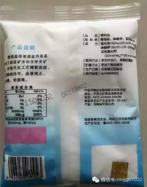 真鹽包裝袋上的噴碼不會(huì)重號(hào),假袋子的噴碼都是事先印好的,都一樣,類似假幣的“連號(hào)”。