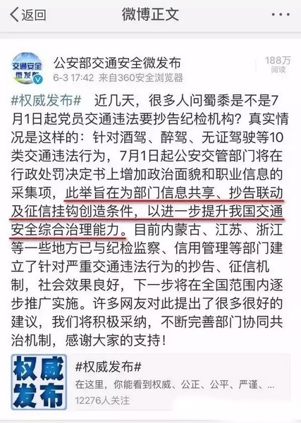此次調(diào)整是公安部按照有關(guān)要求及時向紀(jì)檢監(jiān)察機關(guān)通報涉及中共黨員和國家工作人員實施交通違法行為的一項舉措,目的是為了加強對中共黨員和國家工作人員遵紀(jì)守法、做好表率的監(jiān)督和要求。