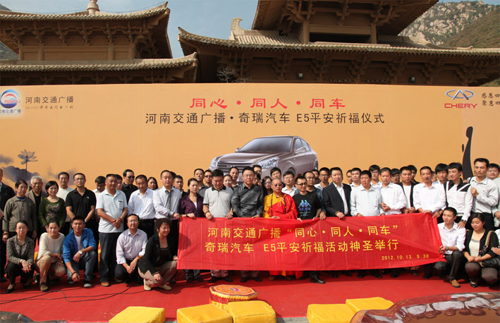 公元2012年10月13日(農(nóng)歷八月二十八)9:36正點(diǎn)時(shí)刻,河南交通廣播“同心?同人?同車(chē)—奇瑞汽車(chē) E5平安”祈?;顒?dòng)神圣舉行。河南交通廣播為了讓本次祈?;顒?dòng)氣氛更好,在更大范圍內(nèi)傳播、弘揚(yáng)禪宗之精神。特把本次活動(dòng)的主要儀式設(shè)置禪文化氛圍濃郁的“禪宗少林·音樂(lè)大典”內(nèi)神圣舉行。