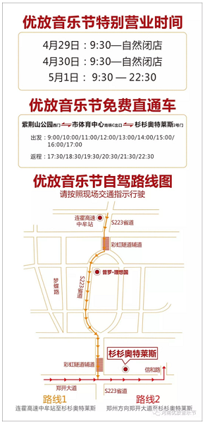 停車:現場為大家準備了充足車位,可根據指示牌停車場停車,五一小長假遇上優(yōu)放音樂節(jié),現場如果人數過多,將會采取限流措施,請大家提前安排好時間前往現場。