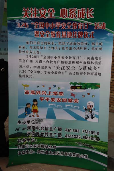 2012年3月26日是第十七個(gè)“全國中小學(xué)安全教育日”,在教育日當(dāng)天舉行“中小學(xué)安全教育基地”掛牌儀式,河南電臺(tái)信息廣播依托日常欄目《法制新河南》的整合資源,將中小學(xué)安全宣傳教育常態(tài)化。據(jù)河南電臺(tái)信息廣播總監(jiān)李金鋒介紹,“教育基地建立以后,河南電臺(tái)信息廣播將聯(lián)合鄭州市公安局柳林分局,通過信息廣播AM603、FM105.6廣播頻率,以《法制新河南》欄目為陣地,長期持久的宣傳中小學(xué)安全教育知識(shí),并為柳林鎮(zhèn)第四小學(xué)的學(xué)生提供書籍、器械等安全教育的物品,節(jié)目主持人和柳林分局的警官還將不定期的深入校園內(nèi),跟學(xué)生們面對(duì)面的交流、一對(duì)一的輔導(dǎo)。”