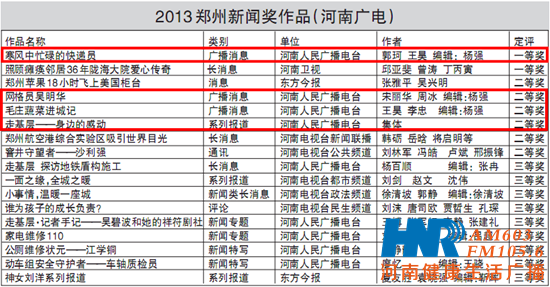 首屆“鄭州新聞獎”在北京評審,評委會對參評作品進行了認真細致的評議,經過初評、定評共評出特等獎3篇、一等獎14篇、二等獎30篇、三等獎42篇。頒獎會對獲獎者頒發(fā)了證書和獎杯,并給予一等獎5000元、二等獎3000元、三等獎2000元的獎勵。河南人民廣播電臺報送的作品以新聞性強、主題重大、思想深刻、制作精良、廣播特色突出而獲評委好評。其中河南電臺信息廣播郭珂、王昊采寫的消息《寒風中忙碌的快遞員》,通過對鄭州市一名普通快遞員劉師傅的跟隨式采訪,將他真實的工作狀態(tài)和內心世界一一展現,生動、感人,獲得了一等獎;《網格員吳明華》、《毛莊蔬菜進城記》、《走基層——身邊的感動》 3 件作品獲得二等獎;《走基層 探訪地鐵盾構施工》等5件作品獲得三等獎。河南電臺信息廣播記者郭珂作為獲獎記者代表在頒獎會上發(fā)了言,表示要按照河南臺的要求和安排,進一步轉變作風,寫出面貌一新、聽眾喜聞樂見、無愧于偉大時代的作品來。