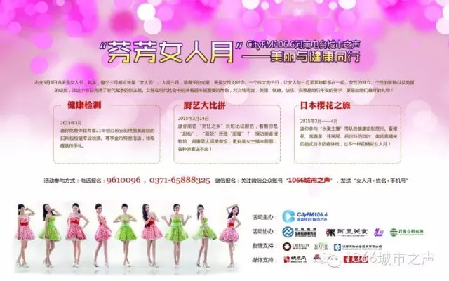 2、微信報名:關(guān)注微信公眾賬號“1066城市之聲”,發(fā)送“女人月+姓名+手機號”