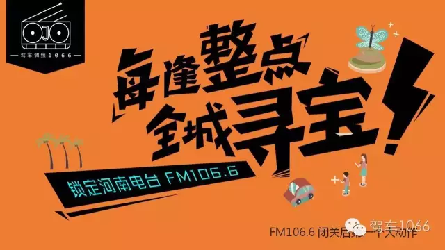 參與方式:現(xiàn)在立刻馬上關(guān)注“駕車1066”官微-每天收聽FM106.6-獲取每個(gè)整點(diǎn)通關(guān)密語(yǔ)-回復(fù)通關(guān)密語(yǔ)到官微后臺(tái)-即可獲得藏寶圖-到指定地點(diǎn)領(lǐng)獎(jiǎng)呦!