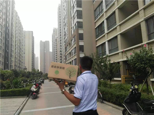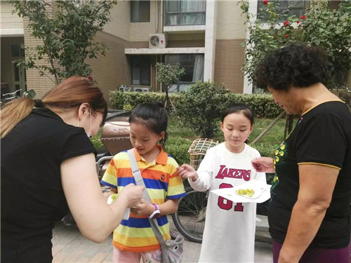 看我們兩位小小志愿者,把新鮮美味的獼猴桃送給小區(qū)的居民品嘗。