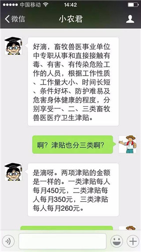 為推動(dòng)“兩項(xiàng)津貼”標(biāo)準(zhǔn)明顯偏低問題的解決,2013年以來,農(nóng)業(yè)部會同有關(guān)部門組成專門調(diào)研組深入多個(gè)省份開展調(diào)研,廣泛聽取各方意見,積極與人社部和財(cái)政部溝通協(xié)調(diào),認(rèn)真研究津貼標(biāo)準(zhǔn)調(diào)整方案,最終實(shí)現(xiàn)了津貼標(biāo)準(zhǔn)大幅提高的政策突破。2015年底人社部、財(cái)政部聯(lián)合下發(fā)的《關(guān)于調(diào)整農(nóng)業(yè)有毒有害保健津貼和畜牧獸醫(yī)醫(yī)療衛(wèi)生津貼的通知》決定從2016年1月1日起,將“兩項(xiàng)津貼”標(biāo)準(zhǔn)提高到原來的8倍左右,一類津貼為每人每月450元,二類津貼為每人每月350元,三類津貼為每人每月260元,所需經(jīng)費(fèi)按現(xiàn)行經(jīng)費(fèi)渠道列支。同時(shí),還明確各地和有關(guān)部門要做好組織實(shí)施工作,嚴(yán)格執(zhí)行政策,加強(qiáng)監(jiān)督管理,確保此項(xiàng)工作落實(shí)到位。
