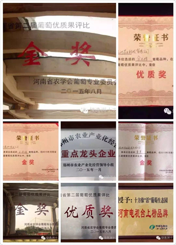 2015年由河南省農學會葡萄專業(yè)委員會舉辦的河南省第二屆葡萄優(yōu)質果評比活動,會上共有來自全省各地的優(yōu)質葡萄品種近200個。河南綠逸洲農業(yè)科技有限公司十方緣“活”葡萄種植基地選送的優(yōu)質葡萄品種夏黑、巨玫瑰分別以85.27和83的總分喜獲金獎;金手指獲得優(yōu)質獎。