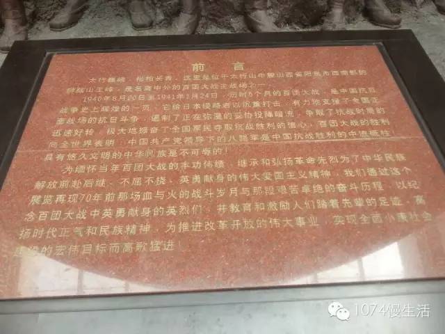 紀(jì)念抗日戰(zhàn)爭(zhēng)暨世界反法西斯戰(zhàn)爭(zhēng)勝利70周年追隨先輩足跡,唱響時(shí)代凱歌——紀(jì)念抗日戰(zhàn)爭(zhēng)暨世界反法西斯戰(zhàn)爭(zhēng)勝利70周年晉冀魯豫記者大型聯(lián)合采訪活動(dòng)《回聲》拉開大幕前方報(bào)道晉冀魯豫四省聯(lián)和采訪團(tuán)的第二站來到了山西陽(yáng)泉縣獅腦山百團(tuán)大戰(zhàn)紀(jì)念館,百團(tuán)大戰(zhàn)是中國(guó)抗日戰(zhàn)爭(zhēng)時(shí)期,中國(guó)共產(chǎn)黨領(lǐng)導(dǎo)下的八路軍、新四軍與日軍在中國(guó)華北地區(qū)晉察冀邊區(qū)發(fā)生的一次規(guī)模最大、持續(xù)時(shí)間最長(zhǎng)的戰(zhàn)役。