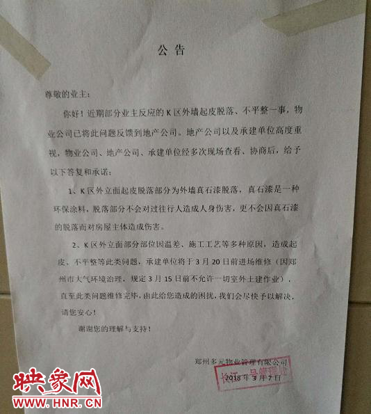 不過(guò),發(fā)稿前,“大象幫辦”記者接到了該小區(qū)物業(yè)的最新消息:為消除業(yè)主的顧慮,他們已在小區(qū)單元門(mén)口張貼公告,向業(yè)主解釋了外立面凸起產(chǎn)生原因,并承諾承建單位工程部將組織維修人員在3月20日之前進(jìn)場(chǎng)維修,直至此類問(wèn)題維修完畢。