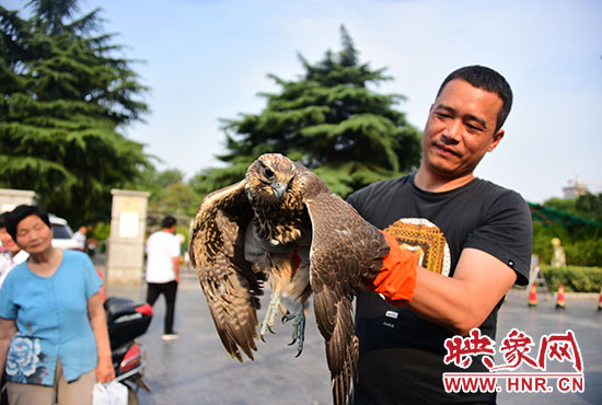 在人民公園西門,當(dāng)獵隼從紙箱里拿出時(shí),霸氣十足威風(fēng)凜凜的它便引來(lái)了眾多市民的圍觀,有人猜是老鷹,有人猜是貓頭鷹。