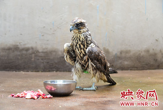 中牟縣林業(yè)局接到警方的電話后,工作人員冉占杰、朱鑫驅(qū)車趕到現(xiàn)場(chǎng),卻也沒(méi)有認(rèn)出該鳥的鳥名。工作人員將大鳥帶回單位后,進(jìn)行喂水喂食。隨后,他們將圖片發(fā)至鄭州市林業(yè)局野生動(dòng)物救護(hù)站。董朝偉站長(zhǎng)認(rèn)出:它非同小可,竟然是國(guó)家二級(jí)重點(diǎn)保護(hù)動(dòng)物,蒙古國(guó)國(guó)鳥,珍稀而罕見的獵隼。