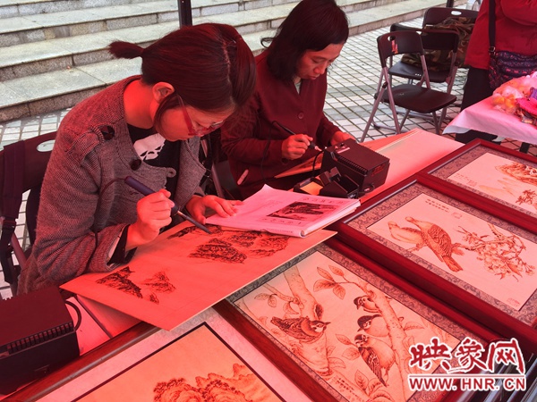 非物質(zhì)文化遺產(chǎn)傳人現(xiàn)場烙畫,每副畫需要兩天方可完成