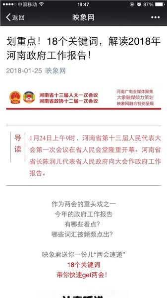 映象網(wǎng)官方微信策劃推出原創(chuàng)策劃《河南人,2018給你穩(wěn)穩(wěn)的幸福!》、《你好,我是河南!這是我的五年成績單,請接收!》、《2018年,河南都有哪些“小目標”?》、《劃重點!18個關鍵詞,解讀2018年河南政府工作報告!》。每篇都刷屏朋友圈,網(wǎng)友積極轉發(fā)點贊,稱“看完真的覺著穩(wěn)穩(wěn)的幸福”。