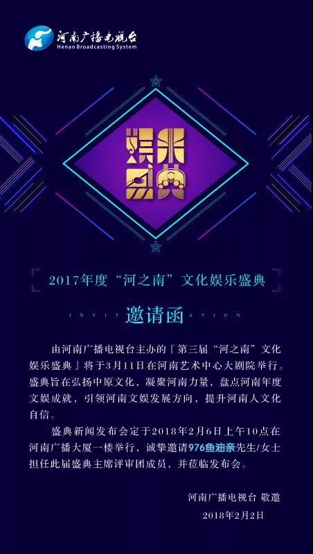 盛典新聞發(fā)布會(huì)定于2018年2月6日上午10點(diǎn)在河南廣播大廈一樓舉行,誠摯邀請976魚油親先生/女士擔(dān)任此屆盛典主席評(píng)審團(tuán)成員,并蒞臨發(fā)布會(huì)。