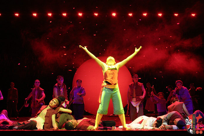 本劇以蓬蓬勃勃、充滿野性、有著旺盛生命力的紅高粱為意像,以九兒和十八刀的愛恨情仇為主線,描繪了上個世紀三、四十年代,先民們敢愛、敢恨、敢生、敢死的自由精神與生命氣度以及他們對入侵者不惜用鮮血和生命抗爭、可歌可泣而又悲壯慘烈的過程。最后九兒用高粱酒做炸藥,引爆了日本人的軍火車,軍火車的爆炸又扎爆了熟透了的高粱米,滿天都飄灑著絢麗的高粱花——這是他們的鮮血之花、靈魂之葩,更是他們精神的升華。