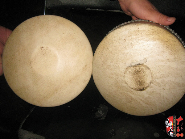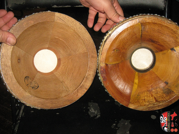 二團著名的鼓師石振虎對于板鼓的使用非常講究 左邊是《程嬰救孤》專用的