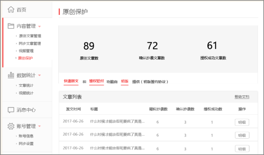 一點號、鳳凰號為自媒體用戶提供原創(chuàng)文章版權(quán)保護功能。 其中,鳳凰號將于月末開啟維權(quán)賠付功能,通過后臺監(jiān)測200+主流平臺,對侵權(quán)抄襲行為一查到底替作者維權(quán)。未來一點號、鳳凰號將會全力打造原創(chuàng)優(yōu)質(zhì)內(nèi)容的版權(quán)保護平臺及監(jiān)測網(wǎng)絡(luò),對于站內(nèi)文章被站外的抄襲也會進行相關(guān)維權(quán)工作。