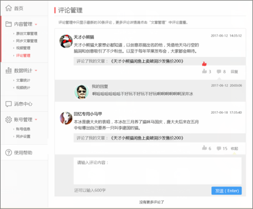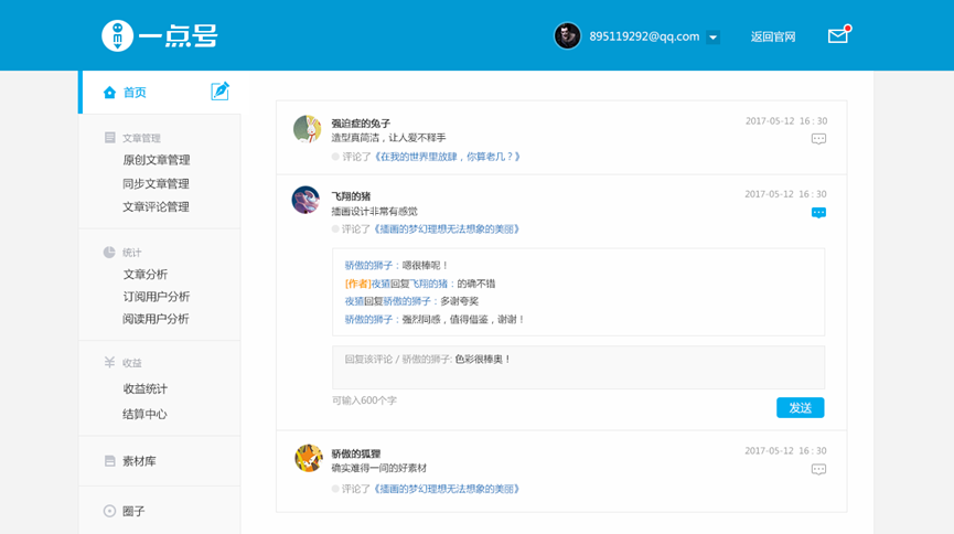 本次積分系統(tǒng)升級之后,一點號、鳳凰號的作者將會更方便快捷的在后臺查看用戶評論,參與用戶討論回復(fù),點贊自己欣賞的讀者評論,能夠更全面更多元化的與讀者進行互動。