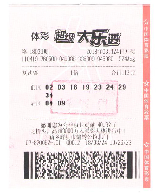 [摘要] 3月24日晚,大樂透第2018033期開獎,全國共中出9注頭獎,其中,河南彩民郝先生以一張“8+2”復式票擒獲大樂透一等獎1注