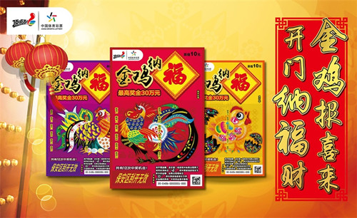 每逢歲末年初,頂呱刮都會(huì)推出賀歲票,今年也不例外,雞年賀歲票“金雞納?!碧崆芭c彩民們見(jiàn)面了。該票有紅、紫、黃三款,以寓意吉祥如意的錦雞為主題,絢麗的色彩中透露出濃濃的中國(guó)風(fēng)。單張面值10元,有12次中獎(jiǎng)機(jī)會(huì),最高獎(jiǎng)金30萬(wàn)元,游戲形式為:刮開(kāi)覆蓋膜,在任意一場(chǎng)游戲中如果出現(xiàn)兩個(gè)相同的“雞”標(biāo)志,即中得該場(chǎng)游戲右方所示的金額;如果出現(xiàn)“福”標(biāo)志,即中得該場(chǎng)游戲右方所示金額的兩倍。
