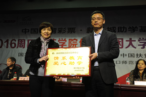 2016年12月7日、8日,中國(guó)體育彩票品牌公益項(xiàng)目“中國(guó)體育彩票新長(zhǎng)城助學(xué)基金”2016年捐贈(zèng)儀式分別在商丘師范學(xué)院和周口師范學(xué)院舉行。據(jù)悉,通過此次捐贈(zèng)活動(dòng),河南省體育彩票管理中心共向兩個(gè)學(xué)校來自全國(guó)14省區(qū)的120名優(yōu)秀貧困大學(xué)生每人捐助5000元,幫助他們和他們的家庭,減輕學(xué)習(xí)生活中的經(jīng)濟(jì)負(fù)擔(dān)。