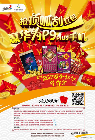 值此新年來臨之際,體彩頂呱刮為回饋彩民朋友一年來的支持,以及對體彩頂呱刮的關(guān)注,在新年期間開展“搶頂呱刮紅包,中華為P9plus手機”活動。