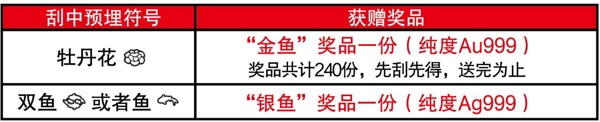 活動(dòng)期間,彩民在我省任一體彩銷(xiāo)售網(wǎng)點(diǎn)購(gòu)買(mǎi)30元面值“富貴有余”主題即開(kāi)票,若單張彩票刮出符合獎(jiǎng)勵(lì)條件的預(yù)埋符號(hào),并經(jīng)兌獎(jiǎng)設(shè)備(IVT或BCR等)完成掃描確認(rèn)(促銷(xiāo)兌獎(jiǎng))且剪角處理后,即可獲贈(zèng)精美獎(jiǎng)品一份,詳見(jiàn)下表: