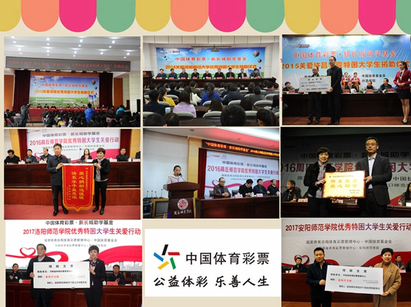 河南省體育彩票管理中心自2013年開始,已經(jīng)連續(xù)五年通過國家體育總局體育彩票管理中心與中國扶貧基金會合作,以“中國體育彩票·新長城助學(xué)基金”形式,向信陽師范學(xué)院、河南師范大學(xué)、許昌學(xué)院、商丘師范學(xué)院、周口師范學(xué)院、洛陽師范學(xué)院、安陽師范學(xué)院共計7所院校的400名優(yōu)秀貧困大學(xué)生累計捐助助學(xué)金200萬元。2015年,河南體彩中心在前兩年每年捐助50名貧困大學(xué)生的基礎(chǔ)上,將受助名額增加到了60名,2016年開始又將捐贈學(xué)校從一所增加到兩所,受助學(xué)生名額從60名又增加到120名,每個學(xué)生的受助金額從4000元提高到了5000元,希望幫助更多的困難學(xué)生及其家庭減輕經(jīng)濟負(fù)擔(dān)和精神壓力。