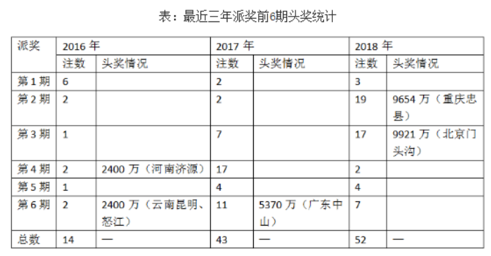 在前6期派獎(jiǎng)中,頭獎(jiǎng)井噴52注,單注最高獎(jiǎng)金為2215萬(wàn)元,單人最高擒獎(jiǎng)9921萬(wàn)元,共爆出2個(gè)近億元大獎(jiǎng)。