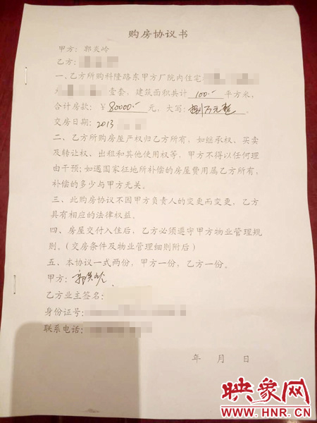 現(xiàn)場的居民向記者出示了當時的一份購房協(xié)議書,房屋售賣甲方的一欄赫然寫著“郭炎嶺”的名字。