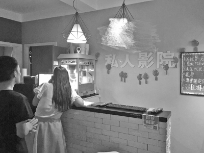 “影院的小包間適合2~4人,大的最多可坐8人?!蓖砩?0點(diǎn),所設(shè)5個(gè)包間已全部滿員,包間都為不帶窗木門,均可反鎖?!昂蛴皬d”內(nèi)設(shè)置有新片推介板、爆米花機(jī)和各式酒水,不少年輕男女正排隊(duì)等待觀影。