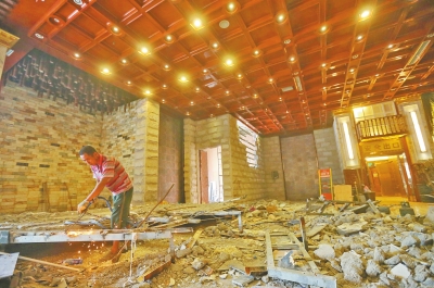 大廳內(nèi),金碧輝煌的樓頂和墻體以及各種燈飾等都還沒有拆除,大廳東側(cè)的一處1尺高的平臺(tái)正在拆除。在切割、拉扯、裝卸等雜音交響中,東北角一名工人拿著大錘對(duì)著室內(nèi)非承重墻猛砸,已砸出一個(gè)大窟窿。很顯然,這里正進(jìn)行大規(guī)模拆除。