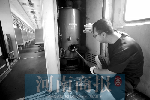 7月28日,新鄉(xiāng)最高氣溫36℃。下午1點(diǎn)30分,河南商報(bào)記者進(jìn)入車廂,車廂內(nèi)溫度計(jì)顯示44℃。這個(gè)時(shí)候,供水員李波和王旭陽,已經(jīng)在車上工作了1個(gè)多小時(shí)。當(dāng)河南商報(bào)記者走近茶爐時(shí),甚至能感覺到毛孔在一瞬間“炸開”。作為上車最早的茶爐工,他們中午12點(diǎn)就要上車,找劈柴、點(diǎn)火、燒水,將每個(gè)硬座車廂的保溫桶和全車66個(gè)暖瓶灌滿。2014年綠皮車相繼淘汰,自此再?zèng)]專人提供用于燃煤茶爐點(diǎn)火的劈柴,全靠供水工自己找尋。